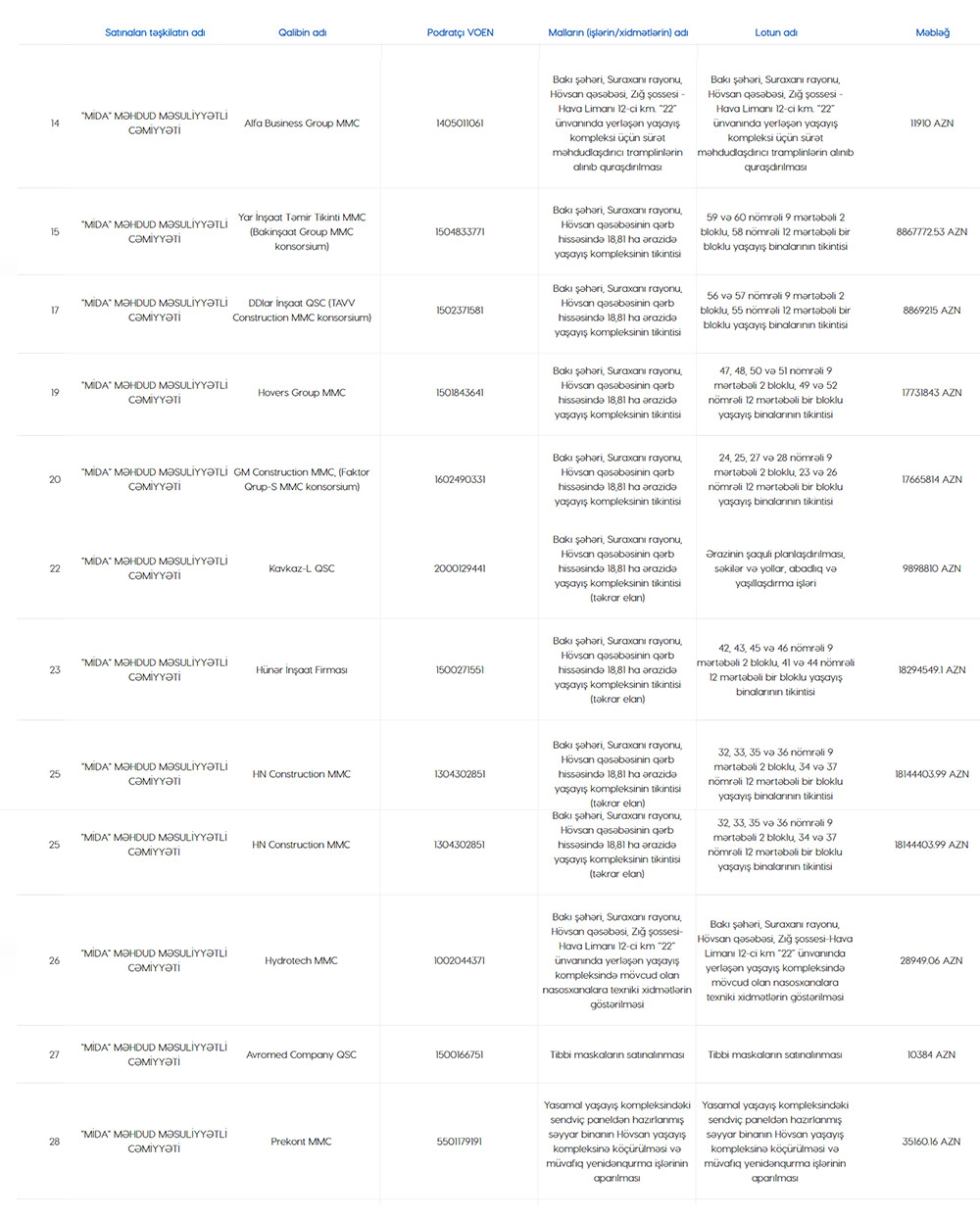 Vahid dövlət satınalmaları portalında verilən məlumata görə, tenderlərin qalibi müvafiq olaraq “Yar İnşaat Təmir Tikinti” MMC, “DDlar İnşaat” QSC, “Hovers Group” MMC, “GM Construction” MMC, “Hünər İnşaat” Firması, “HN Construction” MMC və “Kavkaz-L” QSC-dir.