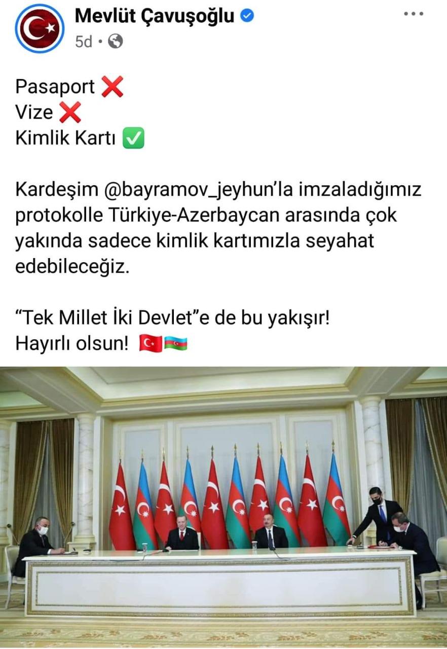 Qeyd edək ki, bu gün,Azərbaycan Respublikası Hökuməti ilə Türkiyə Respublikası Hökuməti arasında qarşılıqlı olaraq vizadan azadetmə haqqında 2020-ci il fevralın 25-də Bakı şəhərində imzalanmış Sazişə dəyişikliklər edilməsi haqqında Azərbaycan Respublikası Hökuməti ilə Türkiyə Respublikası Hökuməti arasında 1 saylı Protokolu Azərbaycan Respublikasının xarici işlər naziri Ceyhun Bayramov və Türkiyə Respublikasının xarici işlər naziri Mövlud Çavuşoğlu imzalayıblar.