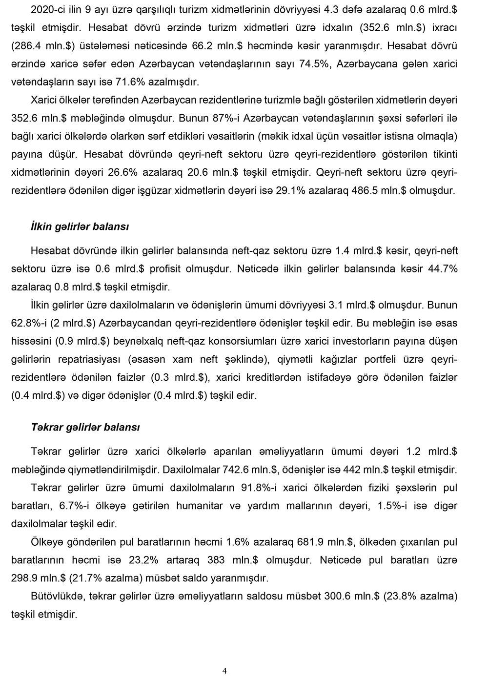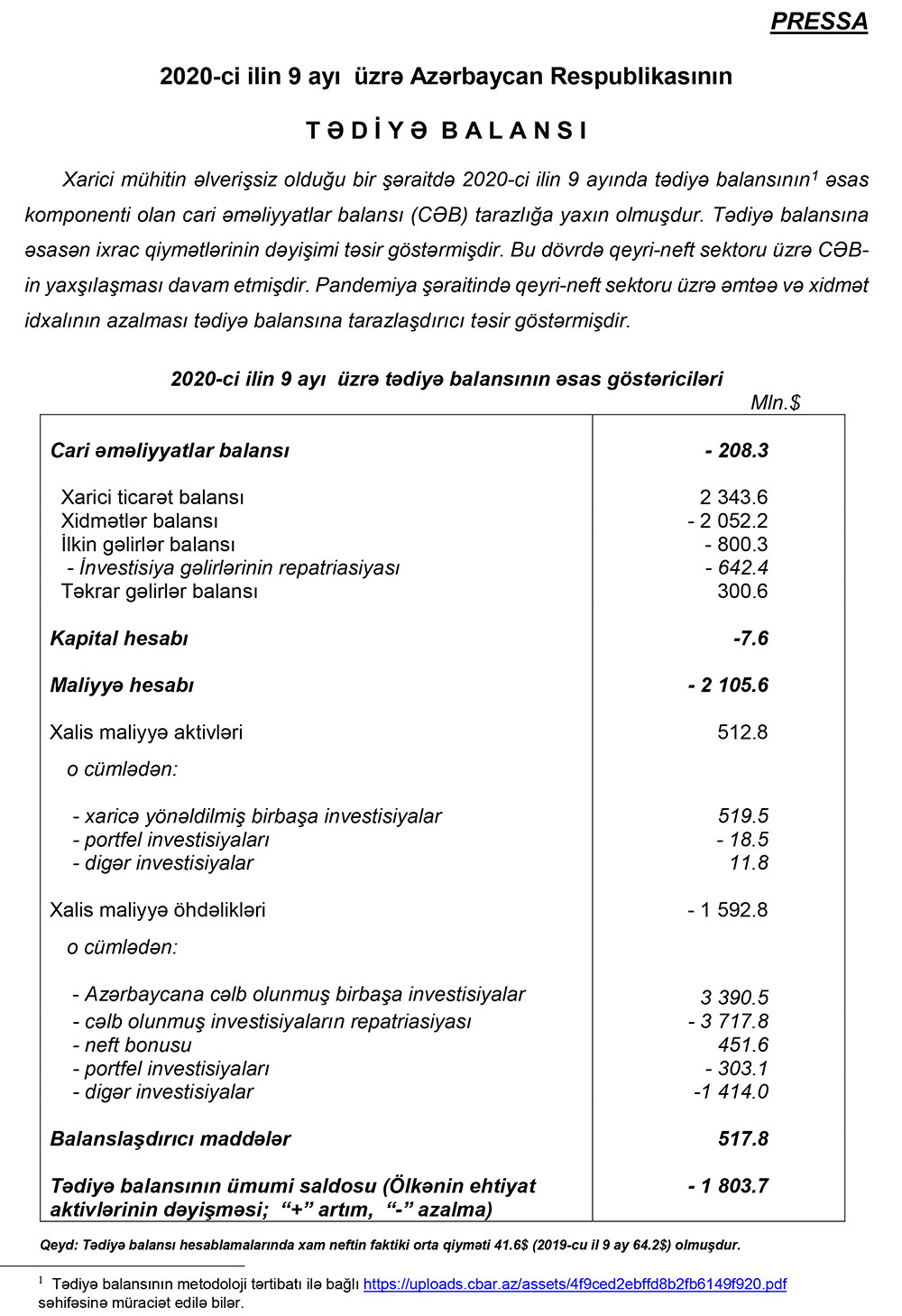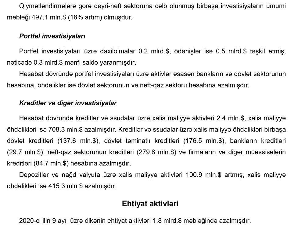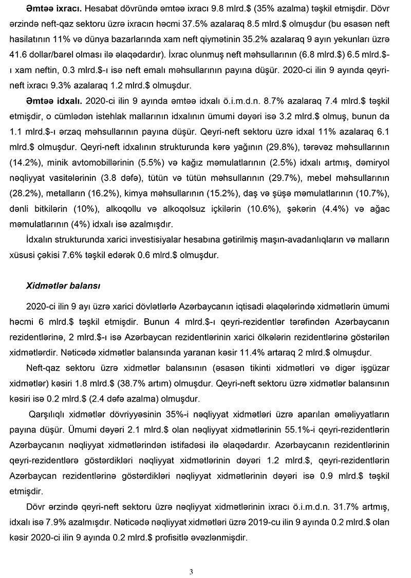 Qeyd edilib ki, xarici mühitin əlverişsiz olduğu bir şəraitdə 2020-ci ilin 9 ayında tədiyə balansının əsas komponenti olan cari əməliyyatlar balansı (CƏB) tarazlığa yaxın olmuşdur. Tədiyə balansına əsasən ixrac qiymətlərinin dəyişimi təsir göstərmişdir. Bu dövrdə qeyri-neft sektoru üzrə CƏBin yaxşılaşması davam etmişdir. Pandemiya şəraitində qeyri-neft sektoru üzrə əmtəə və xidmət idxalının azalması tədiyə balansına tarazlaşdırıcı təsir göstərmişdir.