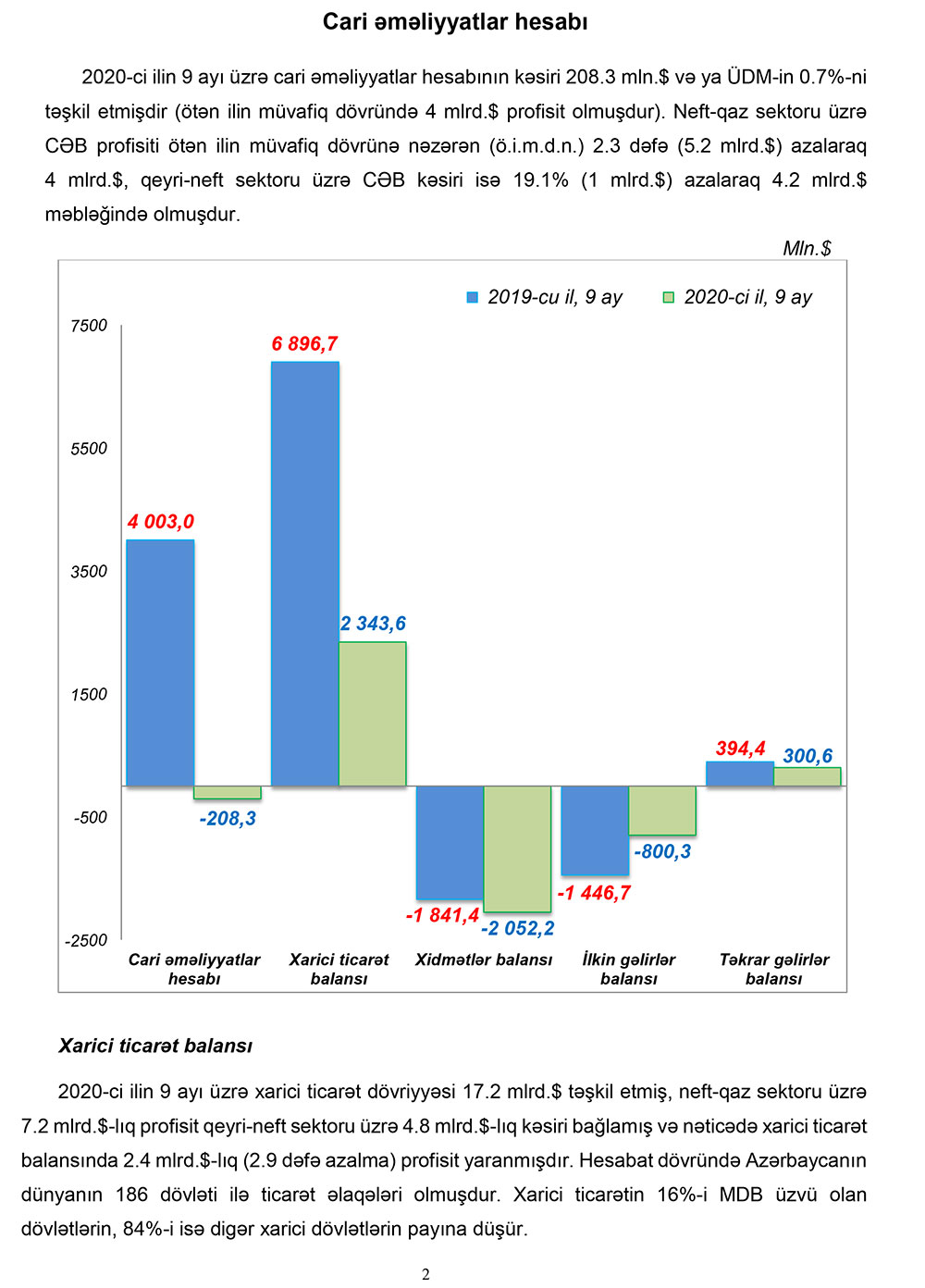 2020-ci ilin 9 ayı üzrə cari əməliyyatlar hesabının kəsiri 208.3 milyon dollar və ya ÜDM-in 0.7%-ni təşkil etmişdir (ötən ilin müvafiq dövründə 4 mlrd. dollar profisit olmuşdur). Neft-qaz sektoru üzrə CƏB profisiti ötən ilin müvafiq dövrünə nəzərən 2.3 dəfə (5.2 milyard dollar) azalaraq 4 milyard dollar, qeyri-neft sektoru üzrə CƏB kəsiri isə 19.1% (1 milyard dollar) azalaraq 4.2 milyard dollar məbləğində olmuşdur.