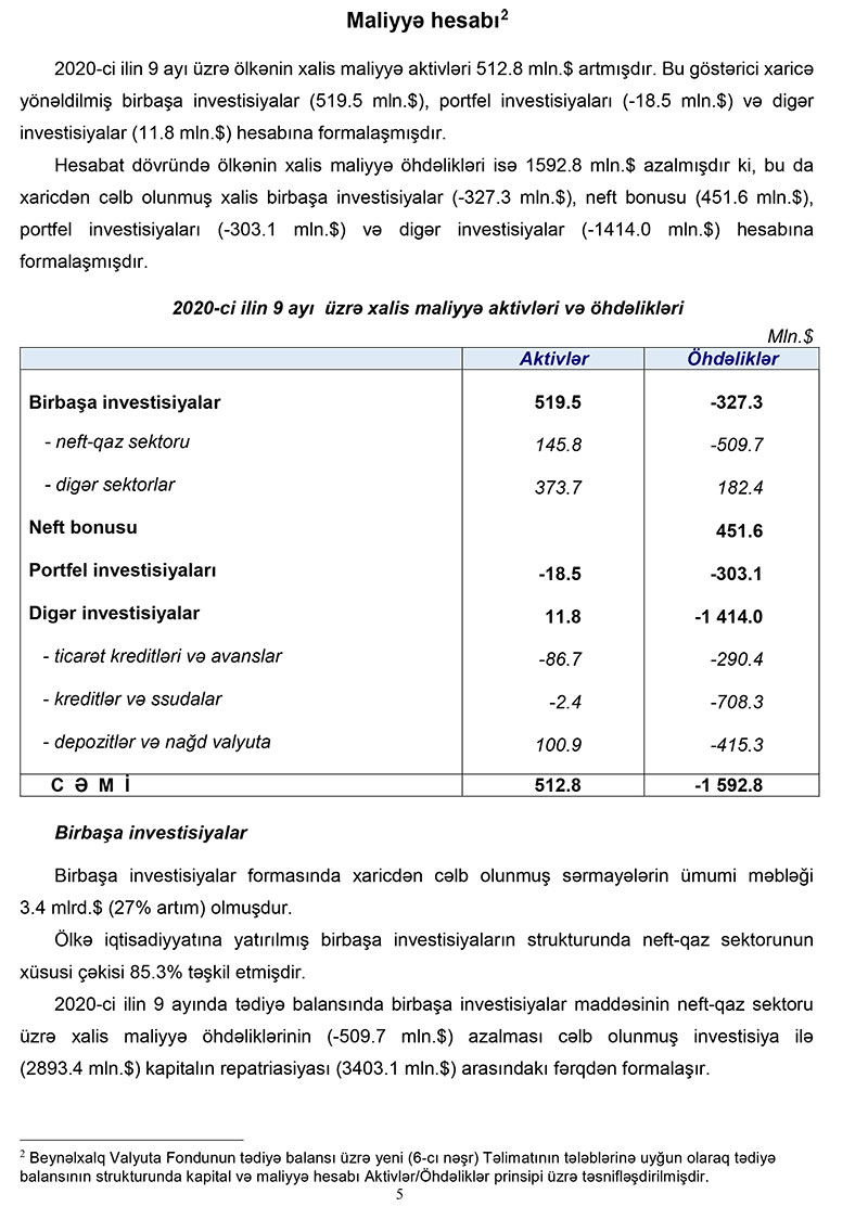 Ötən ilin 9 aynda cari əməliyyatlar hesabında 4 milyard dollar profisit olduğu halda bu ilin eyni dövründə 208.3 milyon dollar kəsir yaranıb.Bu ilin yanvar-sentyabr aylarında Azərbaycanın tədiyyə balansının ümumi kəsiri 1 milyard 803,7 milyon ABŞ dolları təşkil edib. Halbuki ötən ilin eyni dövründə tədiyyə balasında 4 milyard 166,8 milyon dollarlıq qalıq yaranmışdı.