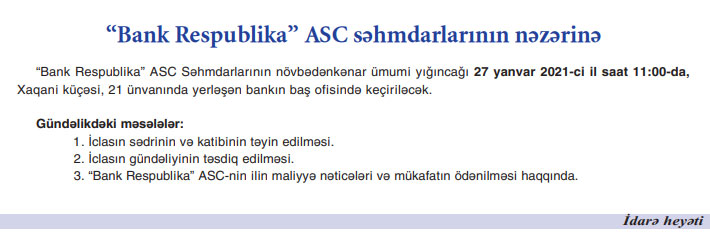 27 Yanvar 2021-ci il tarixində "Bank Respublika" ASC səhmdarlarının növbədənkənar ümumi yığıncağı keçiriləcəkdir.
