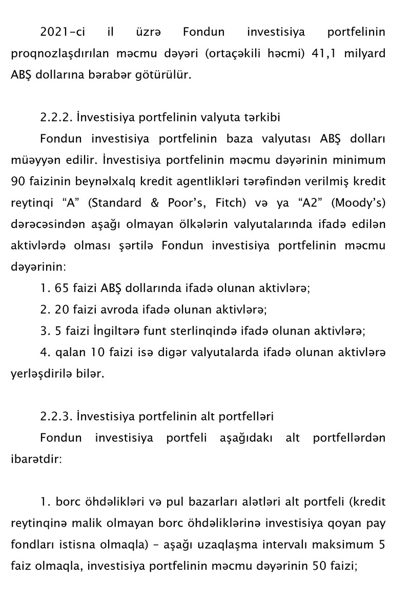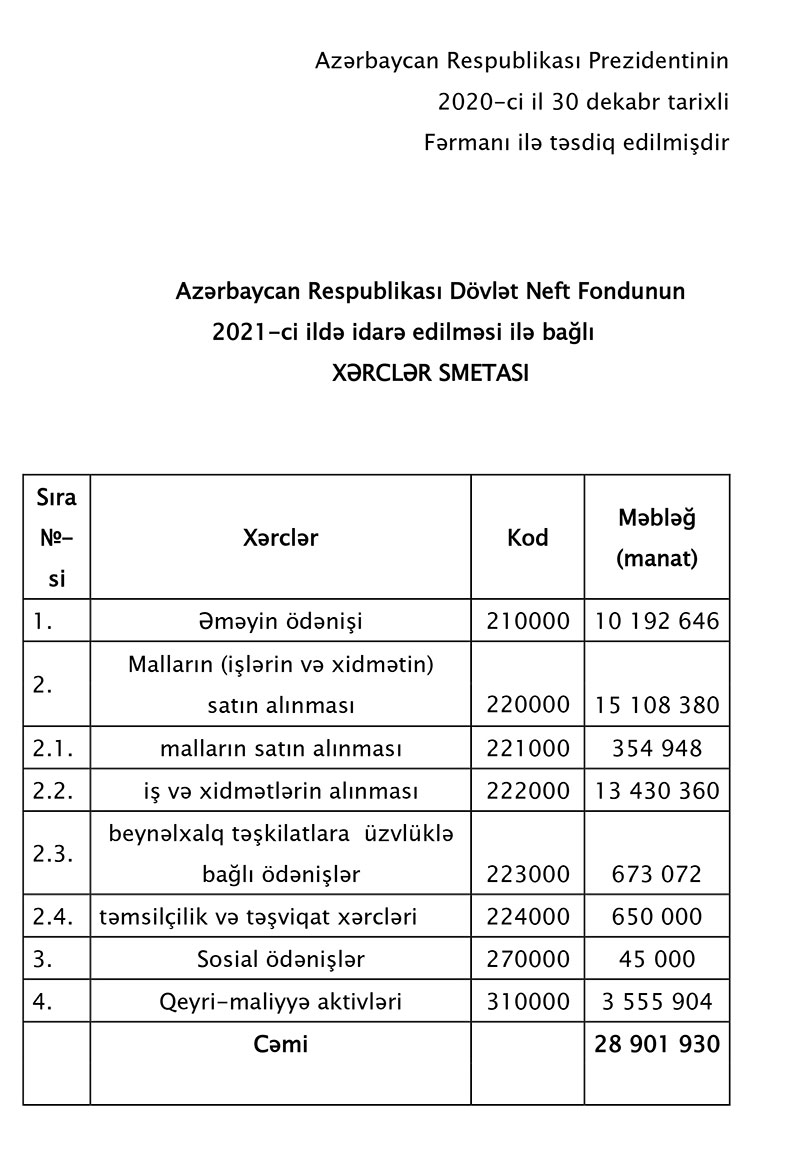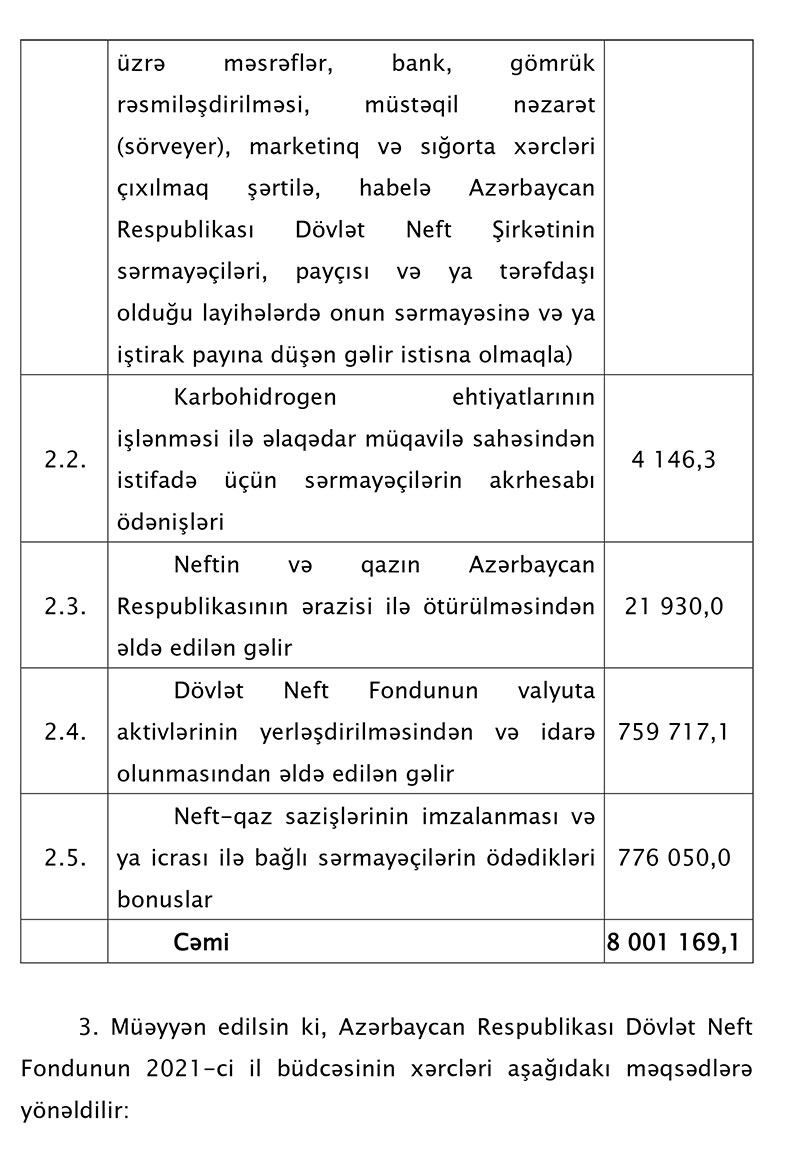 Fərman ilə, Azərbaycan Respublikası Dövlət Neft Fondunun 2021-ci il büdcəsinin gəlirləri 8 milyard 1 milyon 169,1 min manat, xərcləri isə 12 milyard 249 milyon 435,5 min manat məbləğində təsdiq edilib.