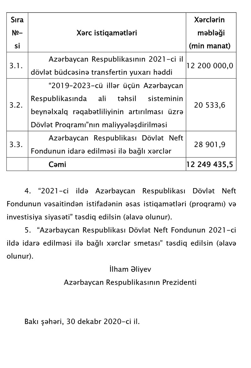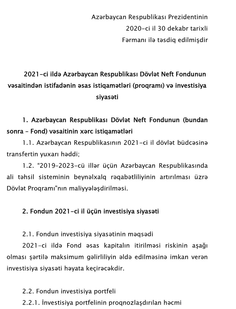Azərbaycan Respublikasının Prezidenti İlham Əliyev "Azərbaycan Respublikası Dövlət Neft Fondunun 2021-ci il büdcəsi haqqında " Fərman imzalyıb.