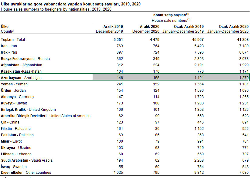 Azərbaycanlılar Türkiyədə 2016-da 610 mənzil, 2017-ci ildə 942 mənzil, 2018-ci ildə 1250 mənzil, 2019-cu ildə 1191 mənzil alıblar. Son 5 ildə (2016-2020) azərbaycanlılar Türkiyədə 5272 mənzil alıblar.