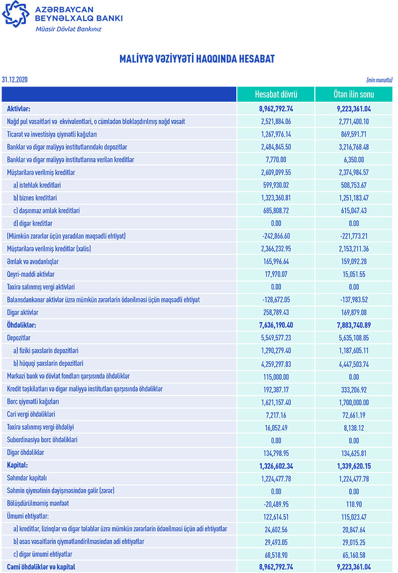 Ötən il Azərbaycan Beynəlxalq Bankı digər banklar və maliyyə institutlarındakı depozitlərini 731 milyon 923 min manat azaldaraq 2 milyard 484 milyon 845 min manata endirib. 2019-cu ilin sonunda bu depozitlər 3 milyard 216 milyon 768 min manat idi.