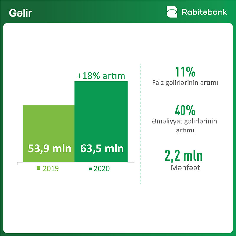 Bankın gəlirləri də 2019-cu il ilə müqayisədə 18% artaraq 63.5 milyon manat təşkil edir. O cümlədən, faiz gəlirləri 11%, əməliyyat gəlirləri isə 40% artıb. Bank 2020-ci ili 2.2 milyon manat mənfəətlə başa vurub.