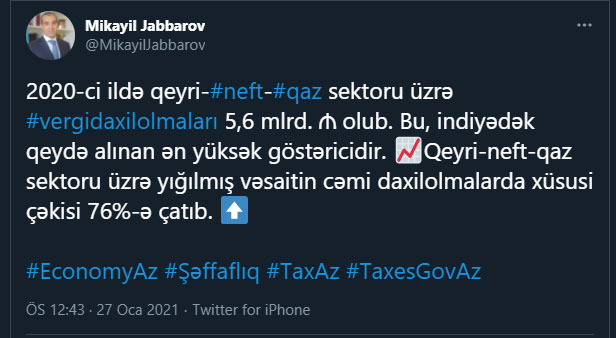 Marja xəbər verir ki, bunu Azərbaycanın iqtisadiyyat naziri Mikayıl Cabbarov "Twitter" hesabında yazıb.