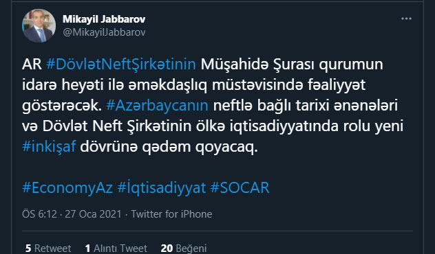 Marja xəbər verir ki, bu barədə Azərbaycanın iqtisadiyyat naziri, SOCAR-ın Müşahidə Şurasının sədri Mikayıl Cabbarov "Twitter" hesabında bildirib.