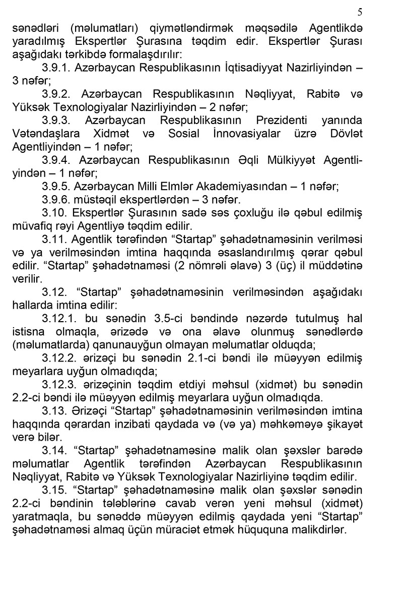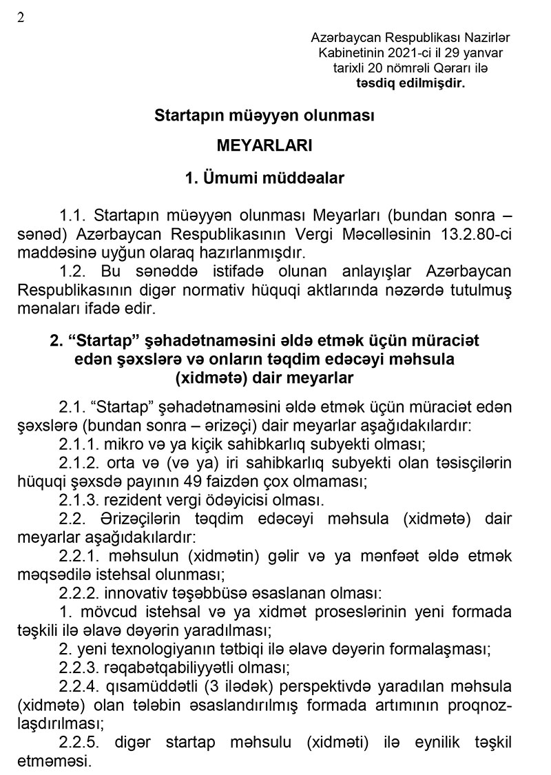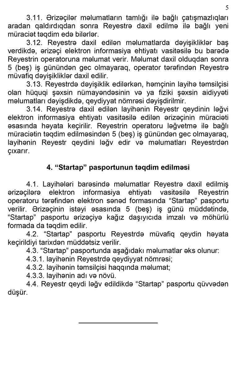 Azərbaycan Respublikasının Nazirlər Kabineti “İnnovativ layihələrin ictimaiyyət üçün açıq reyestrinin aparılması və “Startap” pasportunun verilməsi Qaydaları”nın və “Startapın müəyyən olunması meyarları”nın təsdiq edilməsi barədə qərarlar qəbul edib.