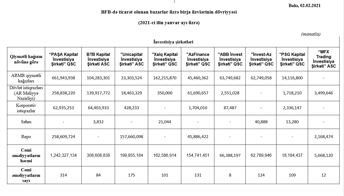 Marja xəbər verir ki, 2021-ci ilin Yanvar ayında ən böyük dövriyyə (1 milyard 242 milyon 327 min 134 manat olmaqla) “PAŞA Kapital” investisiya şirkətində olub. Dövriyyə üzrə 2-ci yeri “BTB Kapital”, 3-cü yeri isə "Unicapital” tutub.
