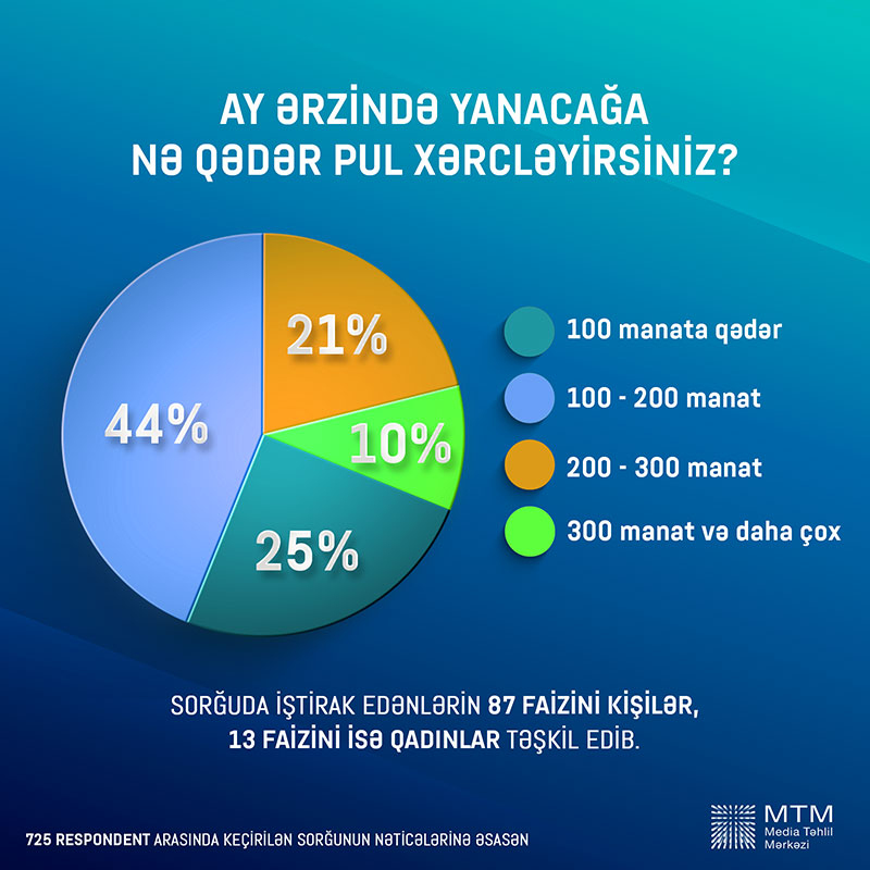 Sorğulananların 43,9%-i ay ərzində yanacağa 100-200 manat, 25%-i isə 100 manata qədər pul xərclədiklərini bildiriblər. Aylıq büdcəsindən yanacağa 200-300 manat ayıranların faiz nisbəti 21,1%, 300 manatdan çox pul xərcləyənlərin faiz nisbəti isə 10% olub.