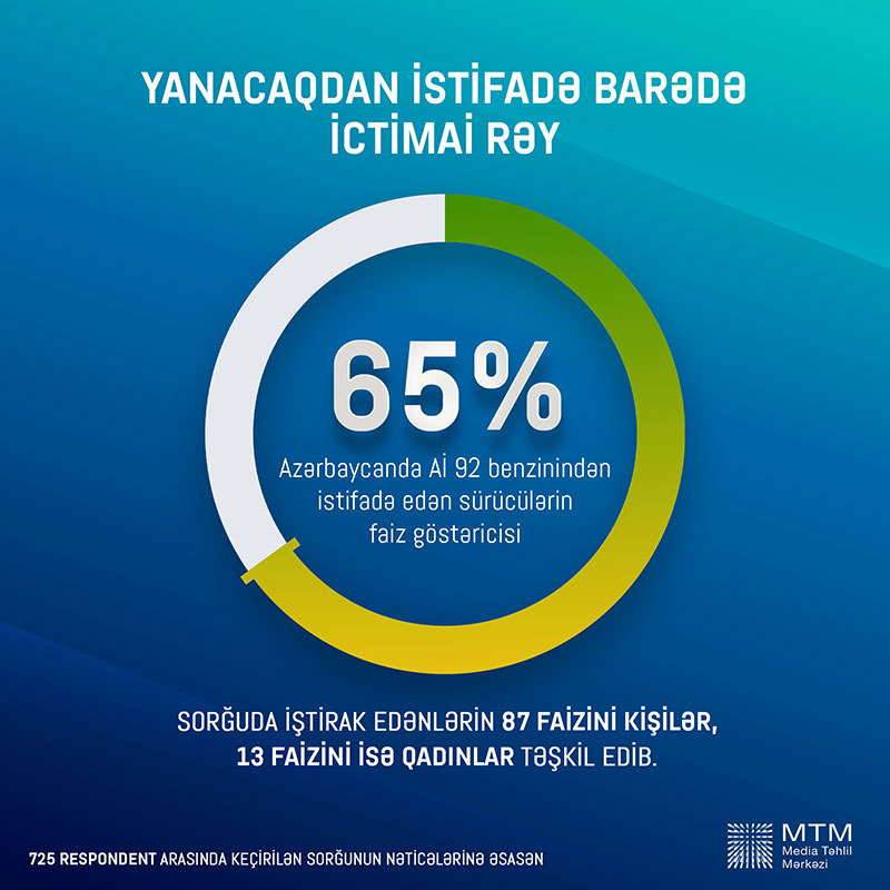 Respondentlərin 65%-i Aİ92 markalı benzindən, 18,5%-i Aİ95 markalı benzidən, 13,4%-i dizel yanacağından, Aİ98 markalı benzindən isə cəmi 2,4%-i istifadə etdiyini bildirib. Maye qaz istifadəçilərinin faiz nisbəti isə 0,4% olub.