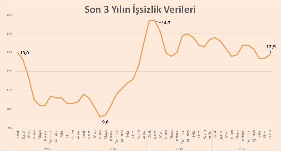 Türkiyədə yaşı 15 və daha yuxarı olan vətəndaşlar arasında işsizlərin sayı 2020-ci ilin Noyabr ayında 2019-cu ilin eyni dövrü ilə müqayisədə 303 min nəfər azalaraq 4 milyon 5 min nəfər təşkil edib.