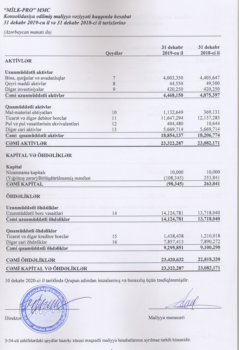 2020-ci il yanvarın 1-nə “Milk-Pro”nun aktivləri 23 milyon 322 min manat olub ki, bu da illik müqayisədə 1% çoxdur. Hesabat dövründə şirkətin öhdəlikləri 2,65% artaraq 23 milyon 421 min manata çatıb, 264 min manatlıq balans kapitalı isə 98 min manatlıq kapital çatışmazlığı ilə əvəz olunub. Kapitalın “mənfi”yə düşməsi kommersiya qurumunun müflislik həddinə düşməsindən xəbər verir.