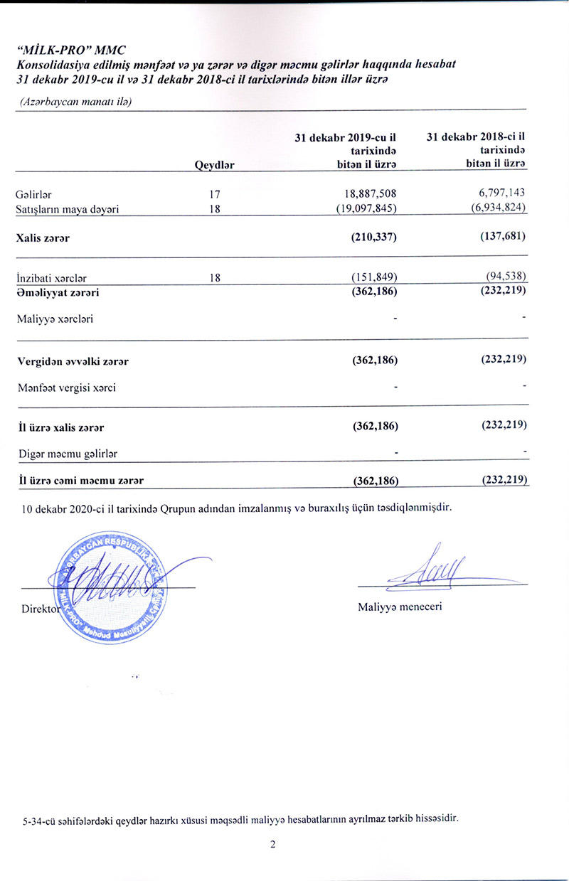 Azərbaycanın aparıcı süd məhsulları istehsalçısı – “Milk Pro” MMC 2019-cu ili 362 min manat zərərlə başa vurub.