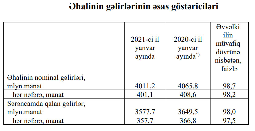 2020-ci ilin yanvar ayı ilə müqayisədə 2021-ci ilin yanvar ayında əhalinin gəlirləri nominal ifadədə 1,3 faiz azalaraq təxminən 4 milyard manat təşkil etmişdir.