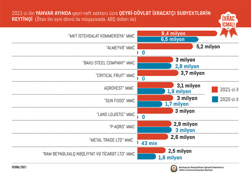 Marja xəbər verir ki, “İxrac İcmalı”nın yanvar sayında qeyri-neft sektoru üzrə əsas ixracatçı şirkətlərin reytinqi verilib. 2021-ci il üzrə hazırlanan qeyri-dövlət ixracatçı subyektlərin reytinqində ilk onluqda aşağıdakı şirkətlər təmsil olunurlar: