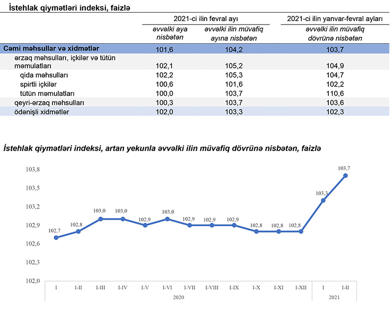 Dövlət Statistika Komitəsinin yaydığı məlumata görə, 2021-ci ilin yanvar-fevral aylarında istehlak qiymətləri indeksi 2020-ci ilin yanvar-fevral aylarına nisbətən 3,7 faiz, o cümlədən ərzaq məhsulları, içkilər və tütün məmulatları üzrə 4,9 faiz, qeyri-ərzaq məhsulları üzrə 3,6 faiz, əhaliyə göstərilmiş ödənişli xidmətlər üzrə 2,3 faiz artıb.