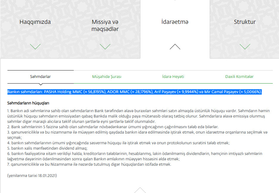 Məlumata görə, Bankın səhmlərinin qalan hissəsi əvvəlki qaydada “PAŞA Holdinq” (56,8 %) və “Ador” (28,2 %) MMC-lərə məxsusdur.