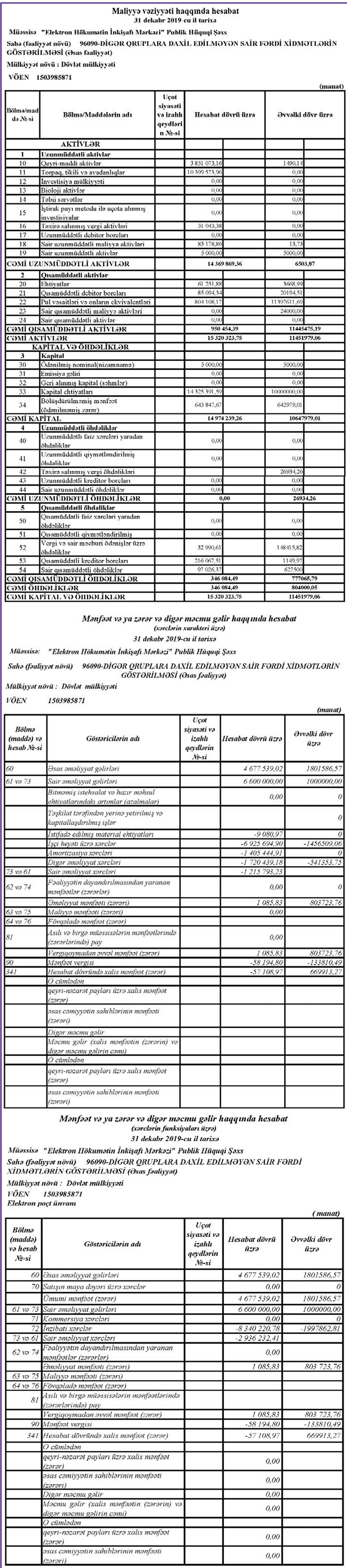 Dövlət informasiya ehtiyatları və sistemlərinin formalaşdırılması, aparılması, inteqrasiyası və effektiv idarə edilməsi sahəsində koordinasiyanı həyata keçirən qurum olan Elektron Hökumətin İnkişafı Mərkəzi publik hüquqi şəxs 2020-ci ili 57 min 109 manat xalis zərər ilə başa vurub. Qurum 2019-cu ili 670 min manat xalis mənfəət ilə başa vurmuşdu.