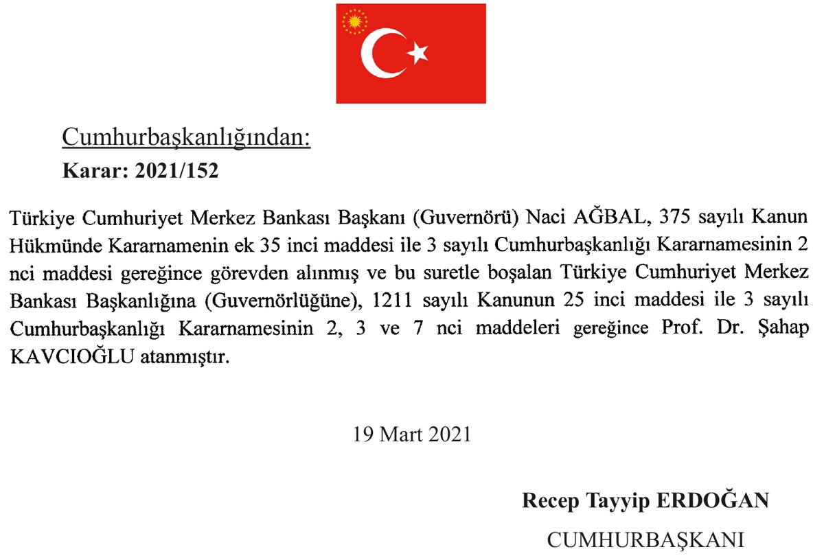 Türkiyə Prezidenti Rəcəb Tayyib Əroğanın imzaladığı Fərman ilə Mərkəzi Bankın sədri Naci Ağbal vəzifəsindən azad edilib.