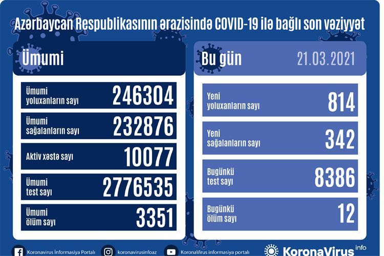 Azərbaycan Respublikasında koronavirus (COVID-19) infeksiyasına 814 yeni yoluxma faktı qeydə alınıb, 342 nəfər müalicə olunaraq sağalıb.