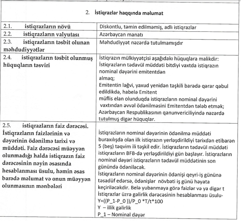 Sənədə əsasən, söhbət hər birinin nominal dəyəri 1 000 manat olan 1 000 ədəd, yəni 1 milyon manatlıq diskontlu, təmin edilməmiş, sənədsiz, adlı istiqrazdan gedir.