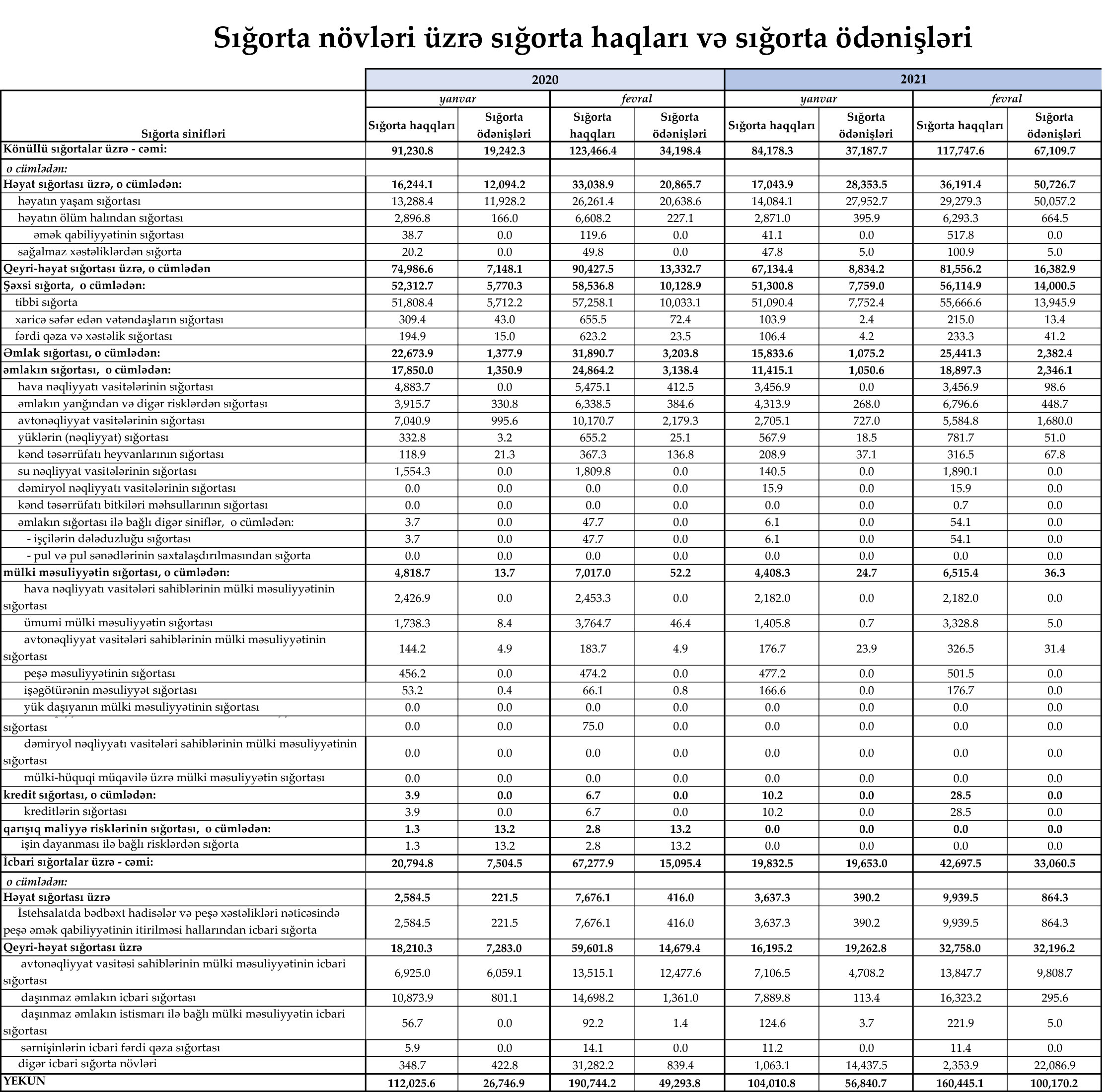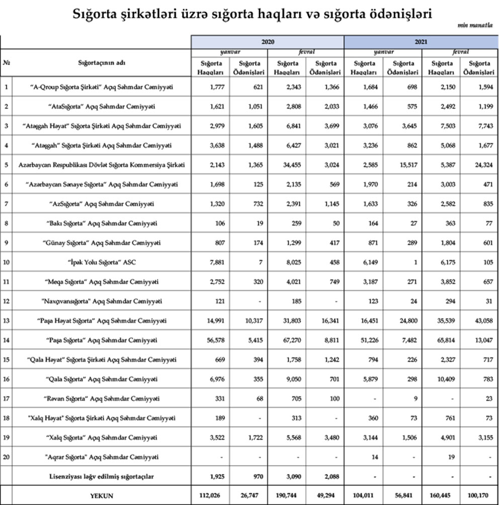 Bu ilin yanvar-fevral aylarında Azərbaycandakı 20 sığorta şirkətinin xətti ilə 160 milyon 445 min manat məbləğində sığorta haqqı toplanılıb.