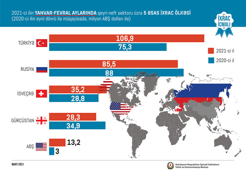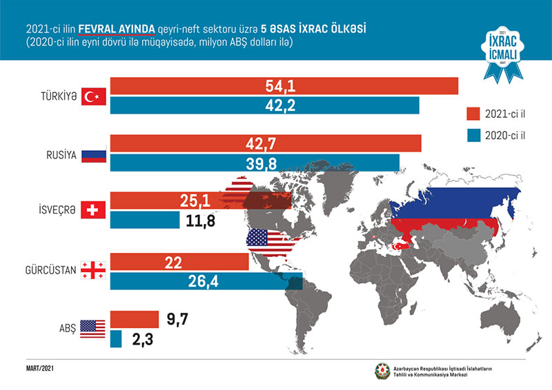 2021-ci ilin yanvar-fevral ayı ərzində Türkiyəyə 106,9 milyon, Rusiyaya 85,5 milyon, İsveçrəyə 35,2 milyon, Gürcüstana 28,3 milyon və ABŞ-a 13,2 milyon ABŞ dolları dəyərində qeyri-neft sektoruna aid mal ixrac olunub.