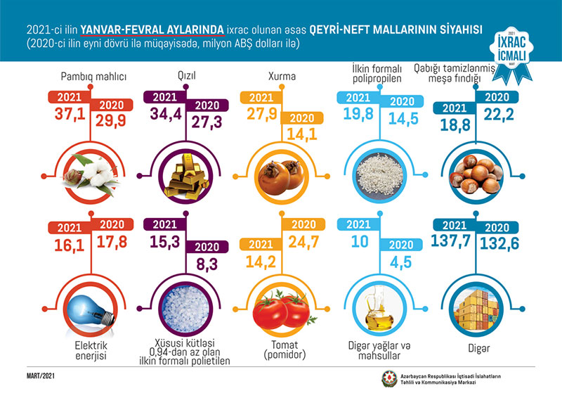 2021-ci ilin yanvar-fevral ayları ərzində ixrac edilən qeyri-neft sektoruna aid malların siyahısında pambıq mahlıcı (37,1 milyon ABŞ dolları) birinci olub. Bu siyahıda qızıl (34,4 milyon ABŞ dolları) ikinci, xurma isə (27,9 milyon ABŞ dolları) üçüncü yerdə qərarlaşıb.
