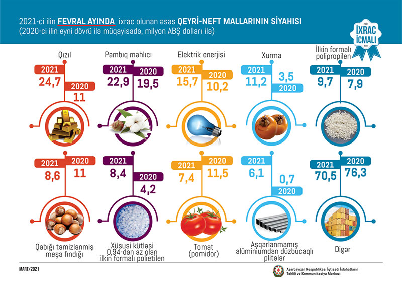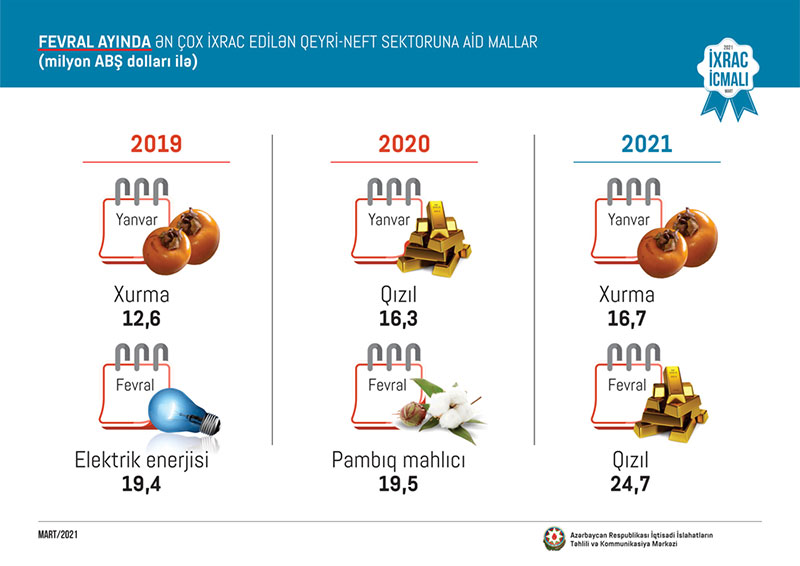 2021-ci ilin fevral ayında ixrac edilən qeyri-neft sektoruna aid malların siyahısında qızıl (24,7 milyon ABŞ dolları) birinci, pambıq mahlıcı (22,7 milyon ABŞ dolları) ikinci və elektrik enerjisi (15,7 milyon ABŞ dolları) üçüncü olub.