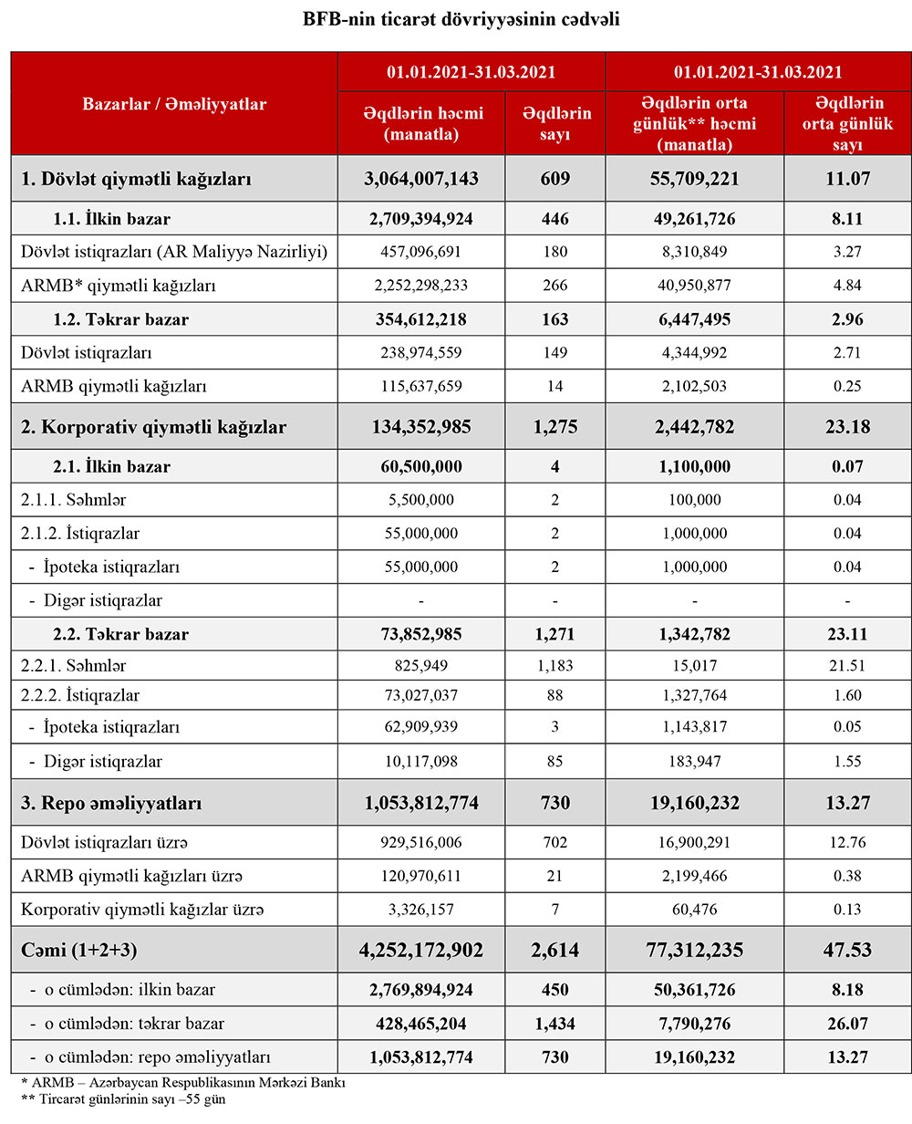 Bakı Fond Birjasında 2021-ci ilin yanvar-mart ayları ərzində qiymətli kağızlar üzrə keçirilən əməliyyatların ümumi həcmi 4 milyard 252 milyon 173 min manat təşkil edib.