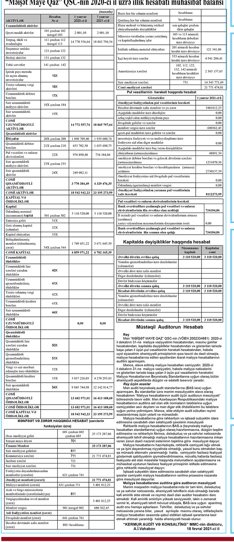 Marja şirkətin maliyyə hesabatlarına istinadən xəbər verir ki, 2020-ci ildə “Məişət Maye Qaz” şirkətinin gəlirləri 25 milyon 173 min manat, cəmi xərcləri 21 milyon 771 min manat, əməliyyat mənfəəti 3 milyon 402 min manat, ödənilmiş mənfəət vergisi 680 min manat təşkil edib.