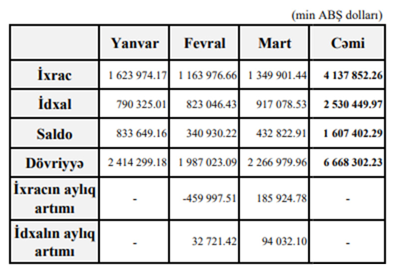 Müqayisə üçün qeyd edək ki, 2020-ci ilin yanvar-mart dövründə Azərbaycanın xarici ticarət əməliyyatlarının həcmi 6 milyard 843 milyon 734 min ABŞ dolları təşkil etmişdi. 2020-ci ilin ilk 3 ayında idxal əməliyyatları üzrə 2 milyard 636 milyon 969 min ABŞ dolları, ixrac əməliyyatları üzrə 4 milyard 206 milyon 765 min ABŞ dolları məbləğində ticarət aparılmışdı. Saldo müsbət 1 milyard 569 milyon 795 min dollar təşkil etmişdi.