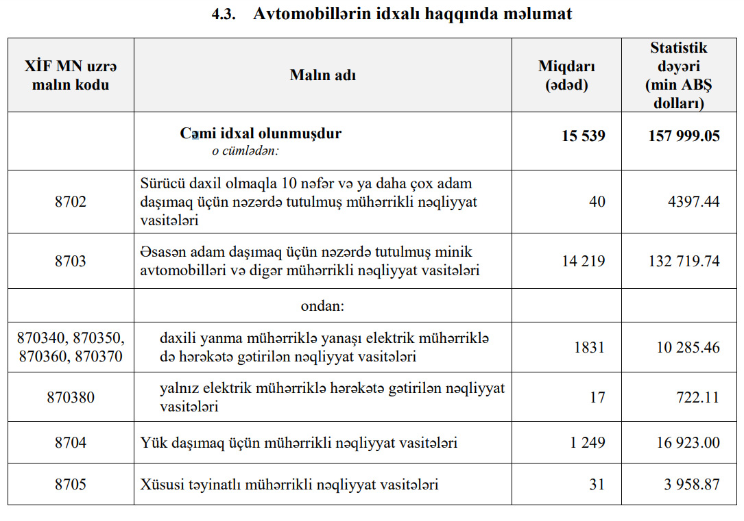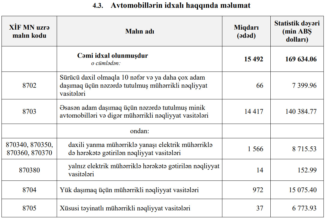 Minik avtomobillərinin idxalı 14 min 417 ədəddən 14 min 219 ədədə geriləyib.