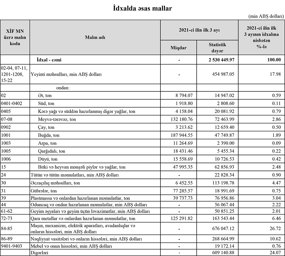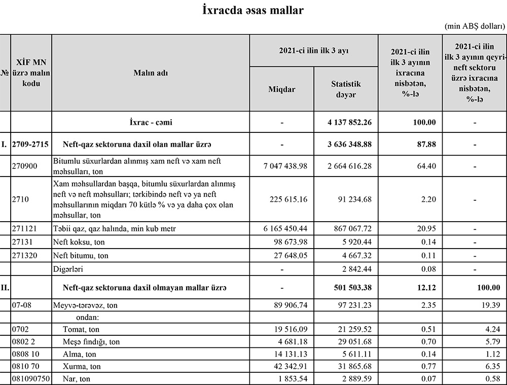 2021-ci ilin yanvar-mart aylarında Azərbaycanın ən çox ixrac və idxal etdiyi mallar.