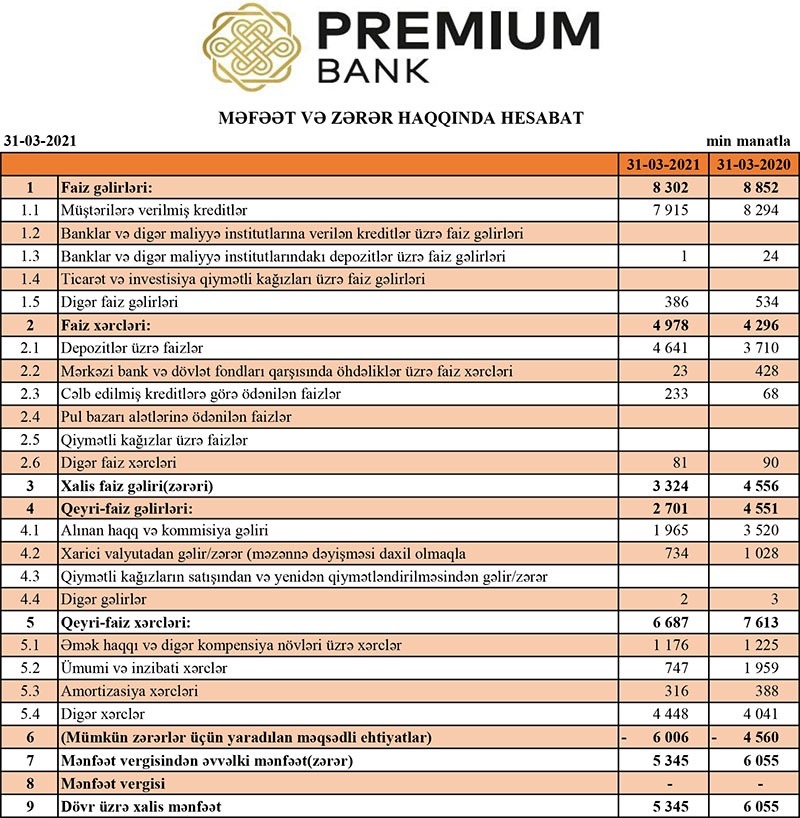 “Premium Bank” ASC 2021-ci ilin ilk rübünü 5 milyon 345 min manat xalis mənfəət ilə başa vurub. Bu, ötən ilin eyni dövrü ilə müqayisədə 11,7% azdır. Bank ötən ilin ilk rübünü 6 milyon 55 min manat xalis mənfəət ilə bağlamışdı.