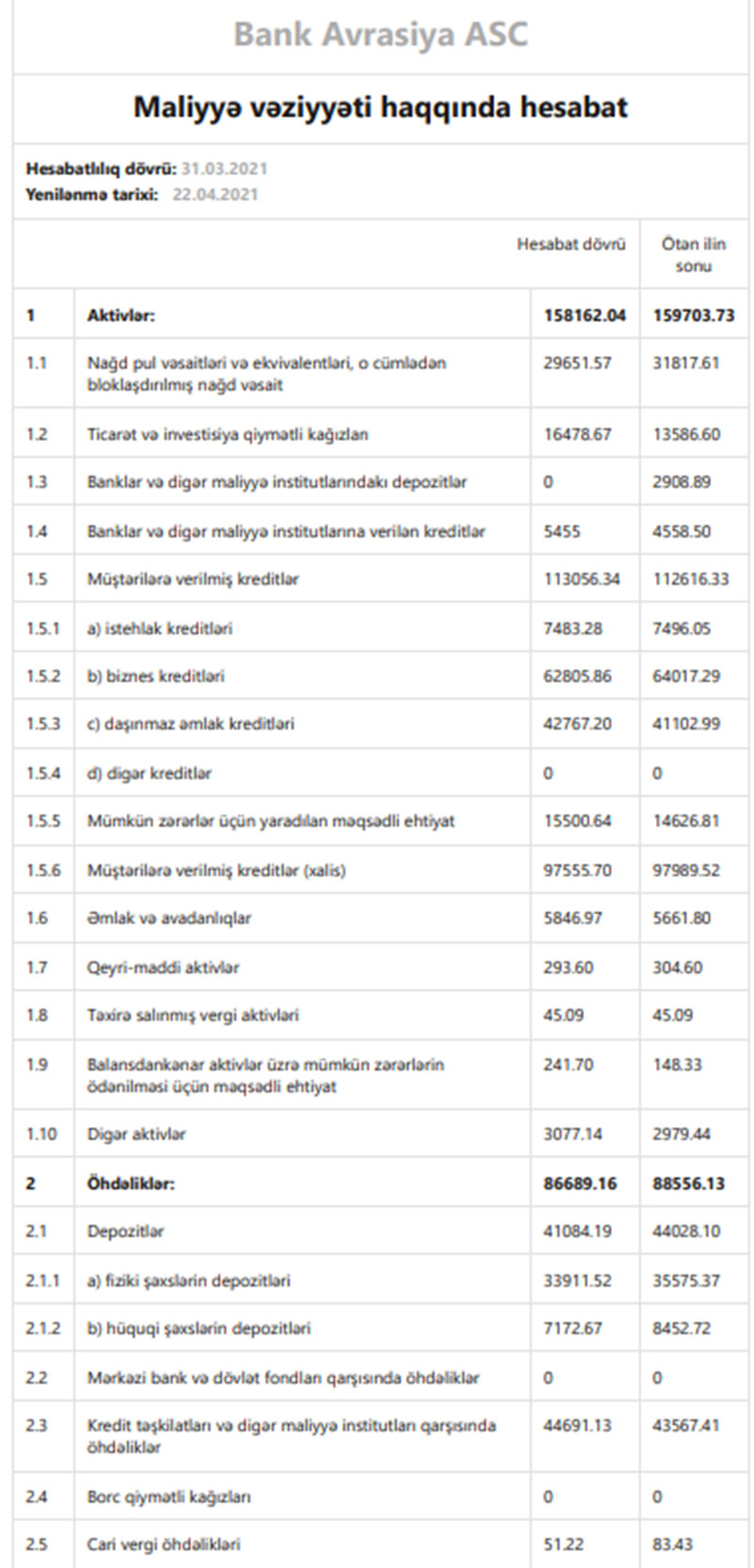 Müqayisə üçün qeyd edək ki, 2020-ci ilin yanvar-mart dövründə “Bank Avrasiya”nın cəmi əməliyyat gəlirləri 3 milyon 100 min manat, cəmi əməliyyat xərcləri 1 milyon 646 min manat, əməliyyat mənfəəti 1 milyon 454 min manat təşkil etmişdi. Bank əməliyyat mənfəətindən 1 milyon 309 min manat mümkün zərərlər üçün yaradılan məqsədli ehtiyatlara ayırdığından ötən ilin ilk rübünü 145 min manat xalis mənfəət ilə bağlamışdı.