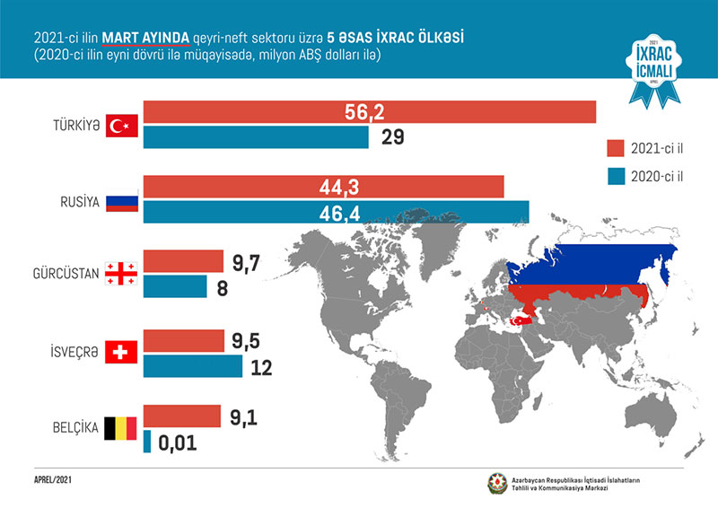 2021-ci ilin birinci rübü ərzində Türkiyəyə 163,1 milyon, Rusiyaya 129,8 milyon, İsveçrəyə 44,7 milyon, Gürcüstana 38 milyon və ABŞ 18,3 milyon ABŞ dolları dəyərində qeyri-neft sektoruna aid mal ixrac olunub.