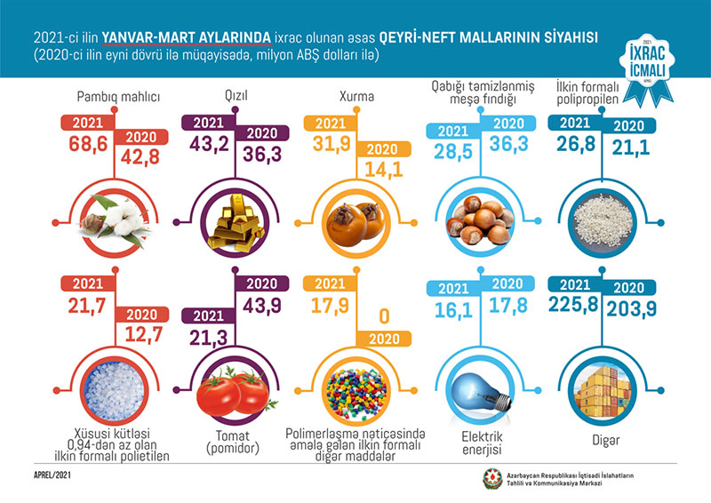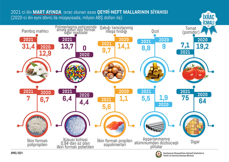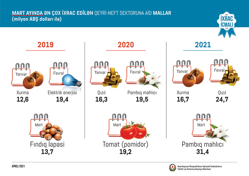 2021-ci ilin mart ayında ixrac edilən qeyri-neft sektoruna aid malların siyahısında pambıq mahlıcı (31,4 milyon ABŞ dolları) birinci, polimerləşmə nəticəsində əmələ gələn ilkin formalı digər maddələr (13,7 milyon ABŞ dolları) ikinci və qabığı təmizlənmiş meşə fındığı (9,7 milyon ABŞ dolları) üçüncü olub.