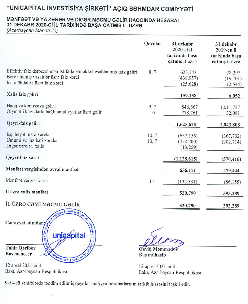 Şirkətin maliyyə hesabatına görə, ötən il "Unicapital"ın ümumi kapitalı 36,4% artıraraq 1, 9 milyon manatı ötüb. Birjada standart bazarda listinqdə olan, nominal qiyməti 3 manat dəyərində 100 000 ədəd səhmin hər biri üzrə gəlir 5,2 manat təşkil edib. 2020-ci ilin nəticələrinə görə, Unicapital dövlət büdcəsinə 100 min manatdan çox mənfəət vergisi ödəyib.