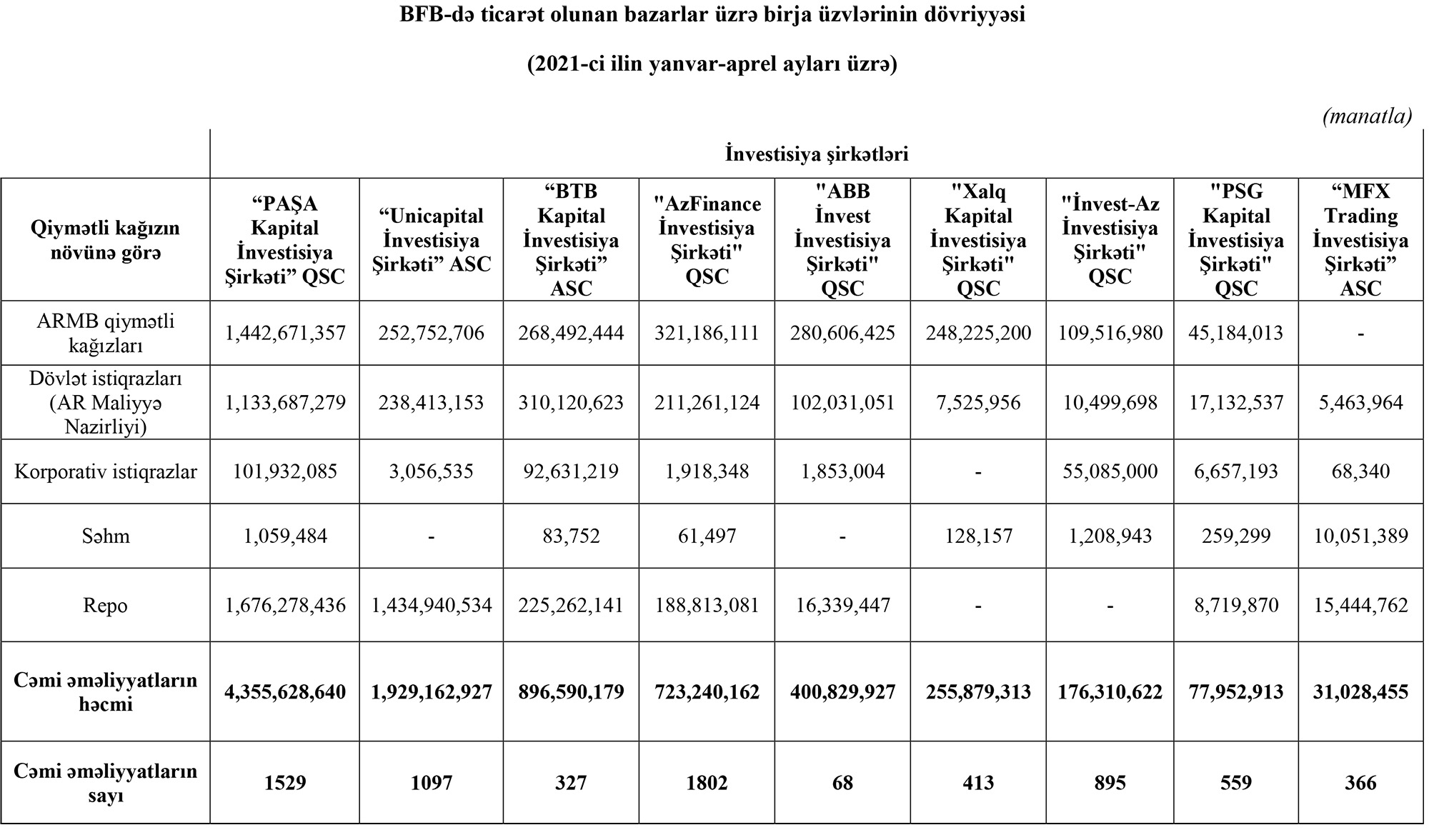 2021-ci ilin ilk 4 ayı ərzində korporativ istiqrazlar ilə aparılan əməliyyatın həcminə görə “PAŞA Kapital İnvestisiya Şirkəti” QSC, “BTB Kapital İnvestisiya Şirkəti” QSCvə "İnvest-Az İnvestisiya Şirkəti" QSC öndə olublar.