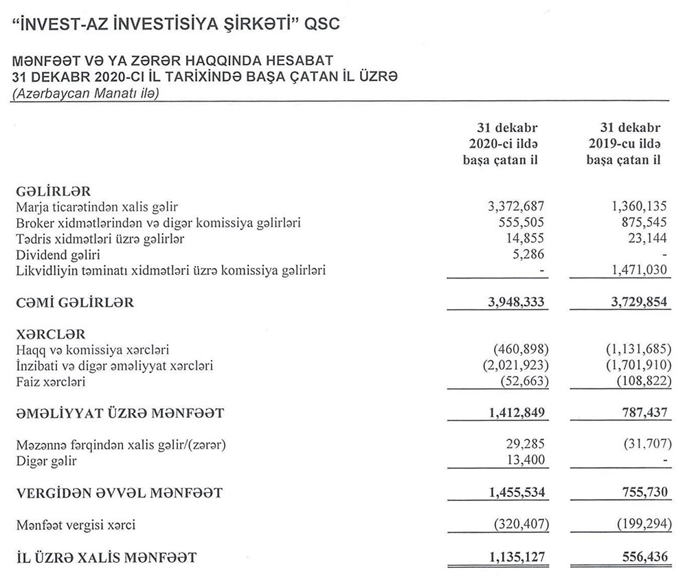 “İnvest-AZ İnvestisiya Şirkəti” QSC 2020-ci ili 1 milyon 135 min manat xalis mənfəət ilə başa vurub. Halbuki, şirkət 2019-cu ili 556 min manat xalis mənfəət ilə bağalmışdı. Beləliklə, ötən il “İnvest-AZ”ın xalis mənfəəti 2 dəfədən çox artıb.