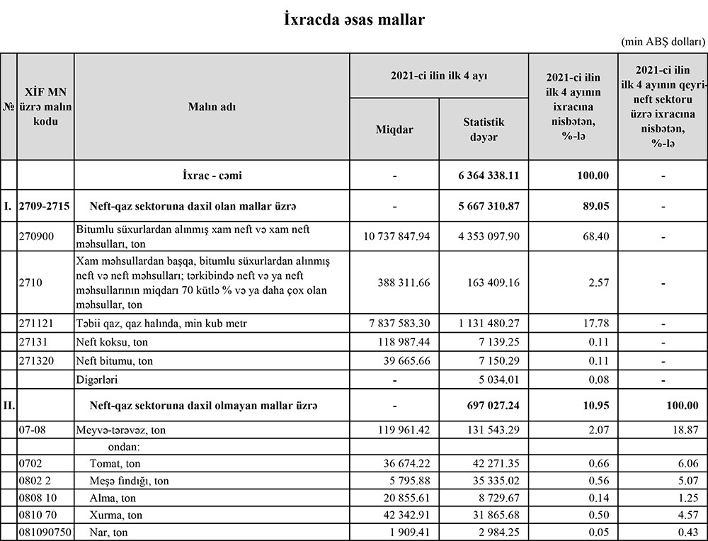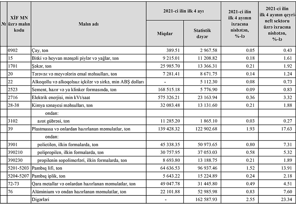 2021-ci ilin yanvar-aprel aylarında Azərbaycanın ən çox ixrac və idxal etdiyi mallar.