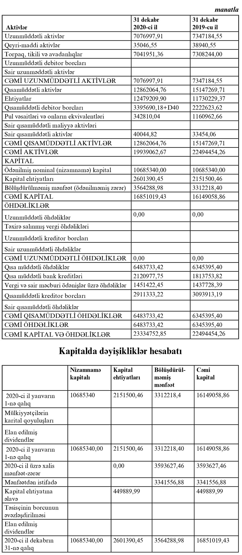“Gəncə Şərab – 2” ASC-nin 2020-ci il dekabrın 31-nə mühasibat balansı