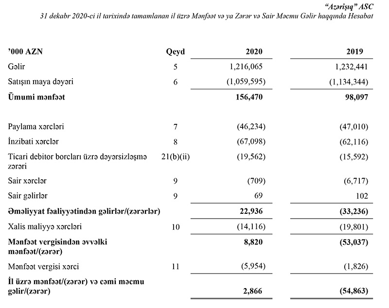 "Azərişıq" ASC 2020-ci ili 2 milyon 866 min manat xalis mənfəətlə başa vurub. Halbuki, qurum 2019-cu ildən 54 milyon 863 min manat xalis zərərlə çıxmışdı.