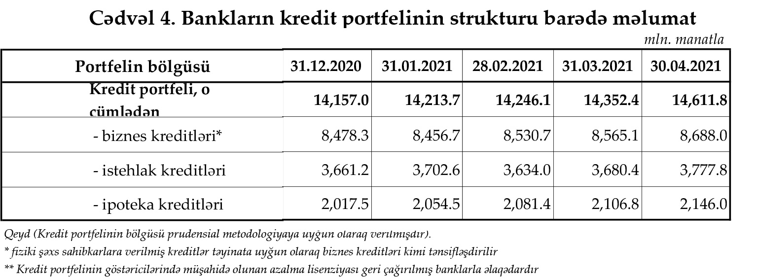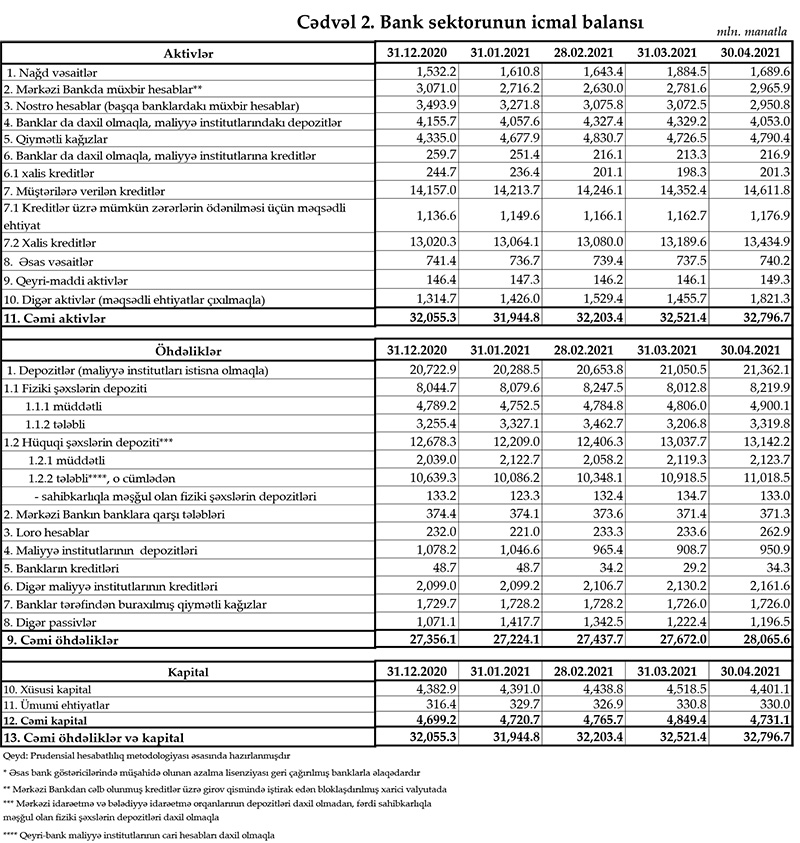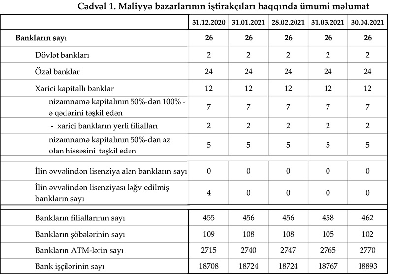 Marja Mərkəzi Banka istinadən 30 aprel 2021-ci il tarixinə olan bank sektorunun əsas göstəricilərini təqdim edir.