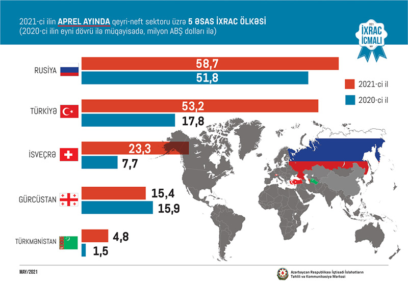 2021-ci ilin aprel ayı Azərbaycanın ümumi ixracı 3,2 milyard ABŞ dolları, qeyri-neft sektoru üzrə ixrac 195,4 milyon ABŞ dolları təşkil edib. 2021-cu ilin aprel ayında qeyri-neft sektoruna aid ən çox mal ixrac edilən ölkələrin siyahısında Rusiya (58,7 milyon ABŞ dolları) birinciliyə yüksəlib. Bu siyahıda Türkiyə ikinci (53,2 milyon ABŞ dolları) və İsveçrə üçüncü (23,3 milyon ABŞ dolları) olub.