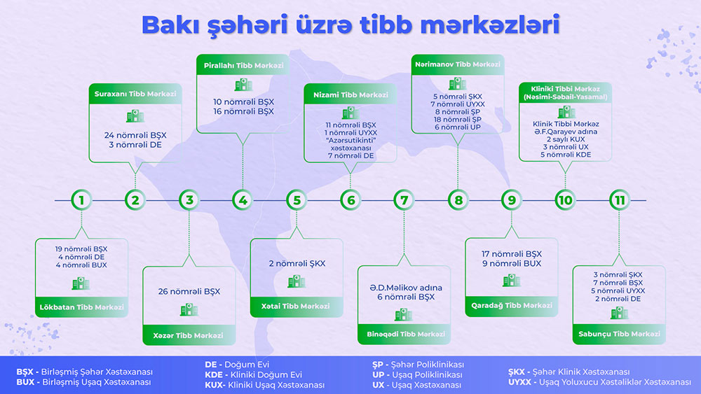 Agentliyin yaydığı məlumata görə, aparılmış struktur dəyişikliyinə əsasən paytaxtda çoxprofilli stasionar və ixtisaslaşdırılmış poliklinik xidmət göstərən tibb müəssisələri müvafiq ərazi üzrə tibb mərkəzlərinin tabeliyinə verilib. Nəsimi rayonu ərazisində fəaliyyət göstərən 1 saylı Kliniki Tibbi Mərkəzin bazasında Nəsimi, Yasamal və Səbail rayonları üzrə tibb müəssisələrini özündə birləşdirən Kliniki Tibbi Mərkəz yaradılıb. Digər inzibati ərazi vahidləri üzrə isə Nərimanov, Nizami, Sabunçu, Binəqədi, Suraxanı, Qaradağ (Lökbatan), Ələt (Qaradağ), Xətai, Pirallahı və Xəzər tibb mərkəzləri təsis olunub. Qaradağ rayonunun ərazisinin böyüklüyü ilə bağlı və sakinlərin tibbi xidmətlərə əlçatanlığını təmin etmək məqsədi ilə sözügedən rayon üzrə 2 tibb mərkəzi (Lökbatan, Qaradağ) yaradılıb.